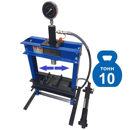 Усилие 10 тонн. Настольный. Ручной. Для запрессовки подшипников, деталей машин, втулок и т.п. в автосервисе, мастерских по ремонту лодочных моторов, велосипедов и т.п. Гидроцилиндр с пуансоном имеет возможность перемещения по всей ширине рамы. Контроль усилия – визуально по шкале манометра. Интервал пуансона 135 мм. Рабочее окно: 400 x 350 мм.