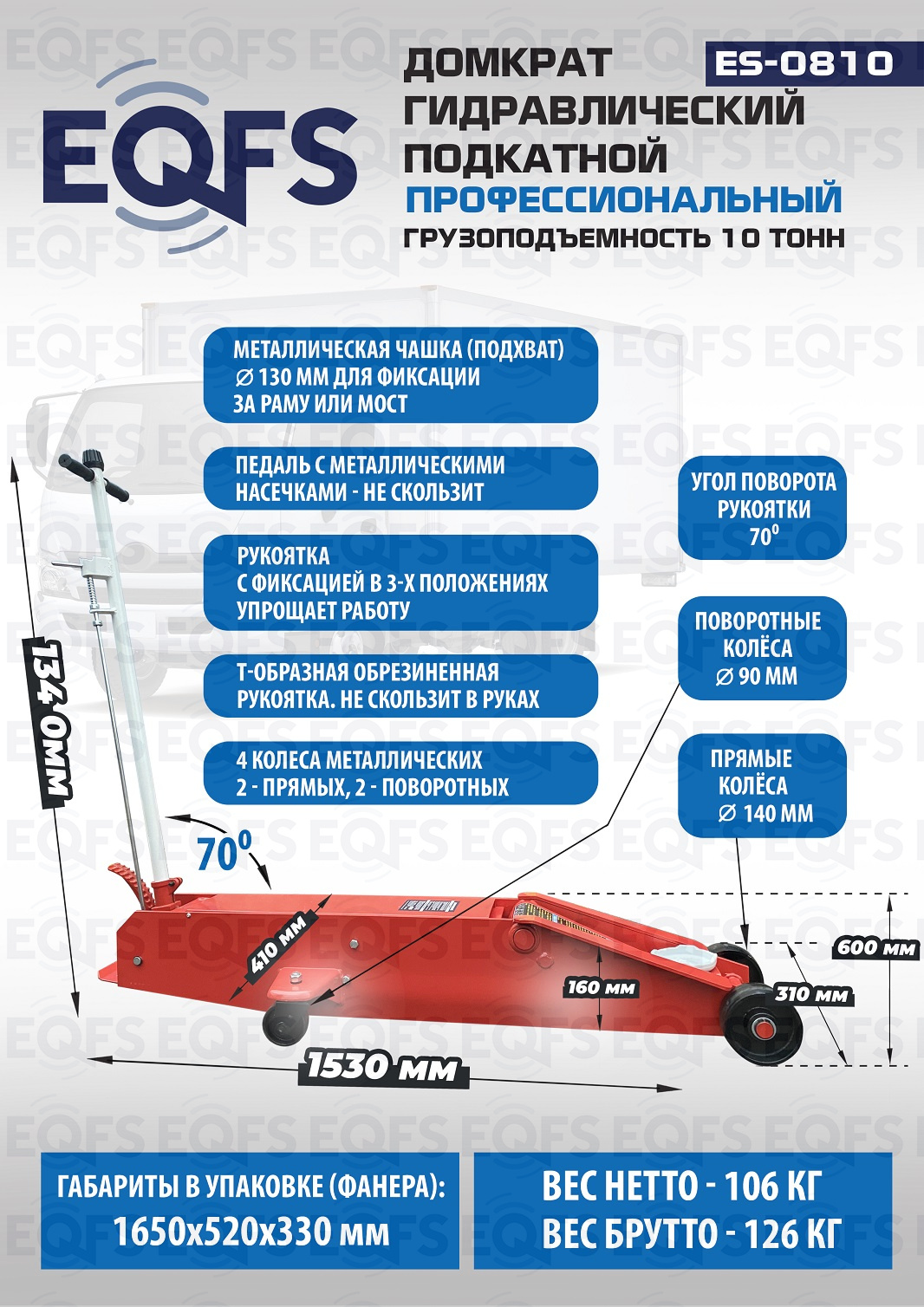 Увеличенный диаметр передних прямых металлических колес грузового домкрата Ǿ-140 мм, позволяет легко транспортировать его по не ровным поверхностям.