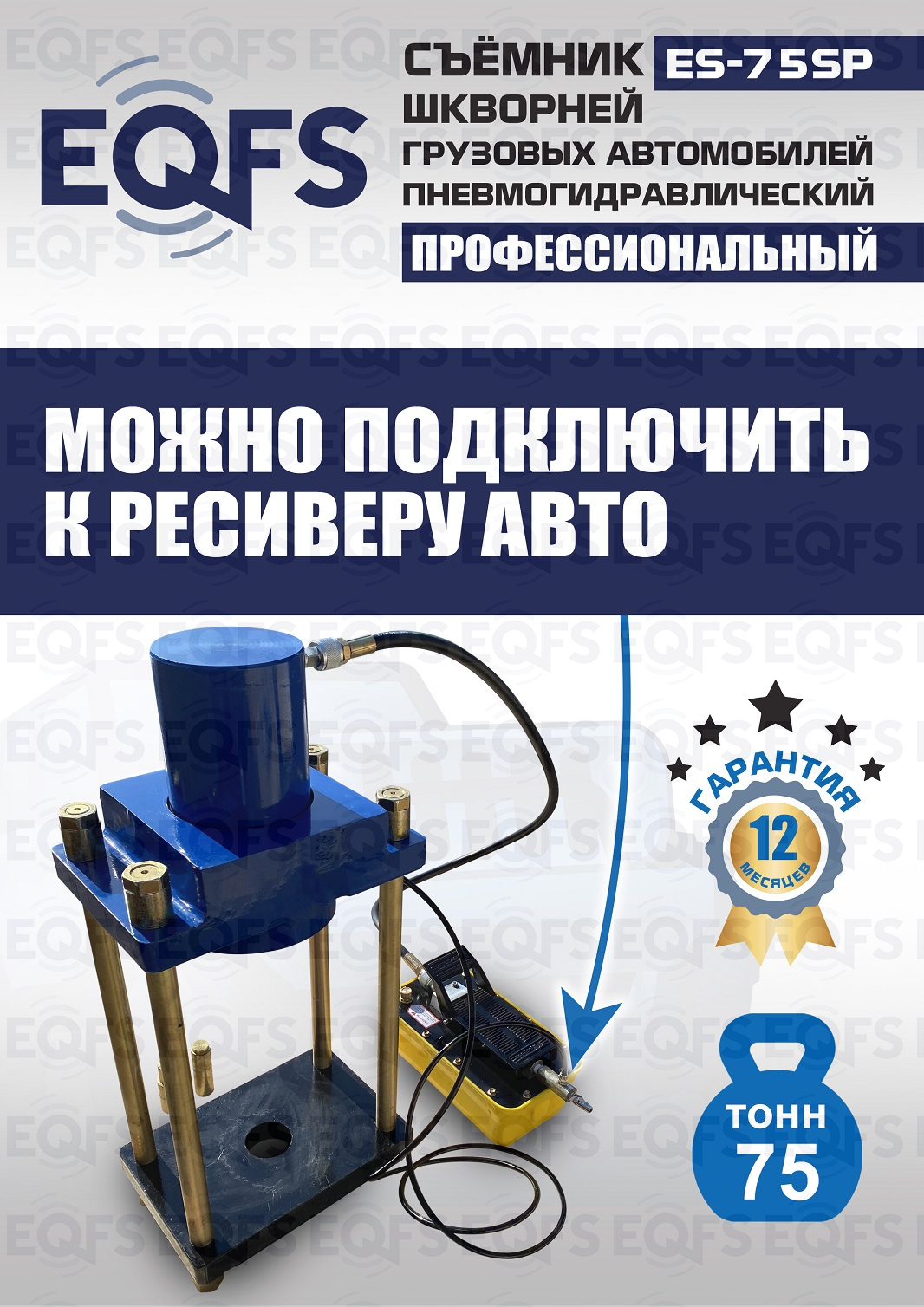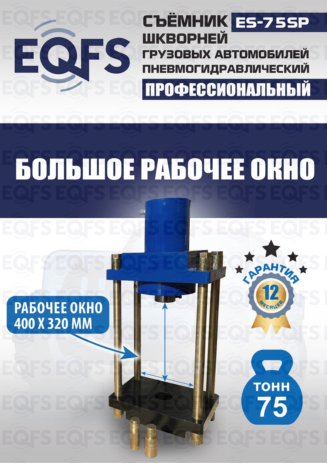 Позволяет работать под разными углами. Сокращает время ремонта. Для выпрессовки шкворней из поворотной цапфы погрузчиков, тракторов, строительной техники, коммерческих и грузовых авто отечественного и импортного производства: MAN, MERCEDES, SCANIA, VOLVO, Корейские и Китайские авто. Пневмогидравлический привод. Рабочее окно 400x320 мм. Усилие 75 тонн.