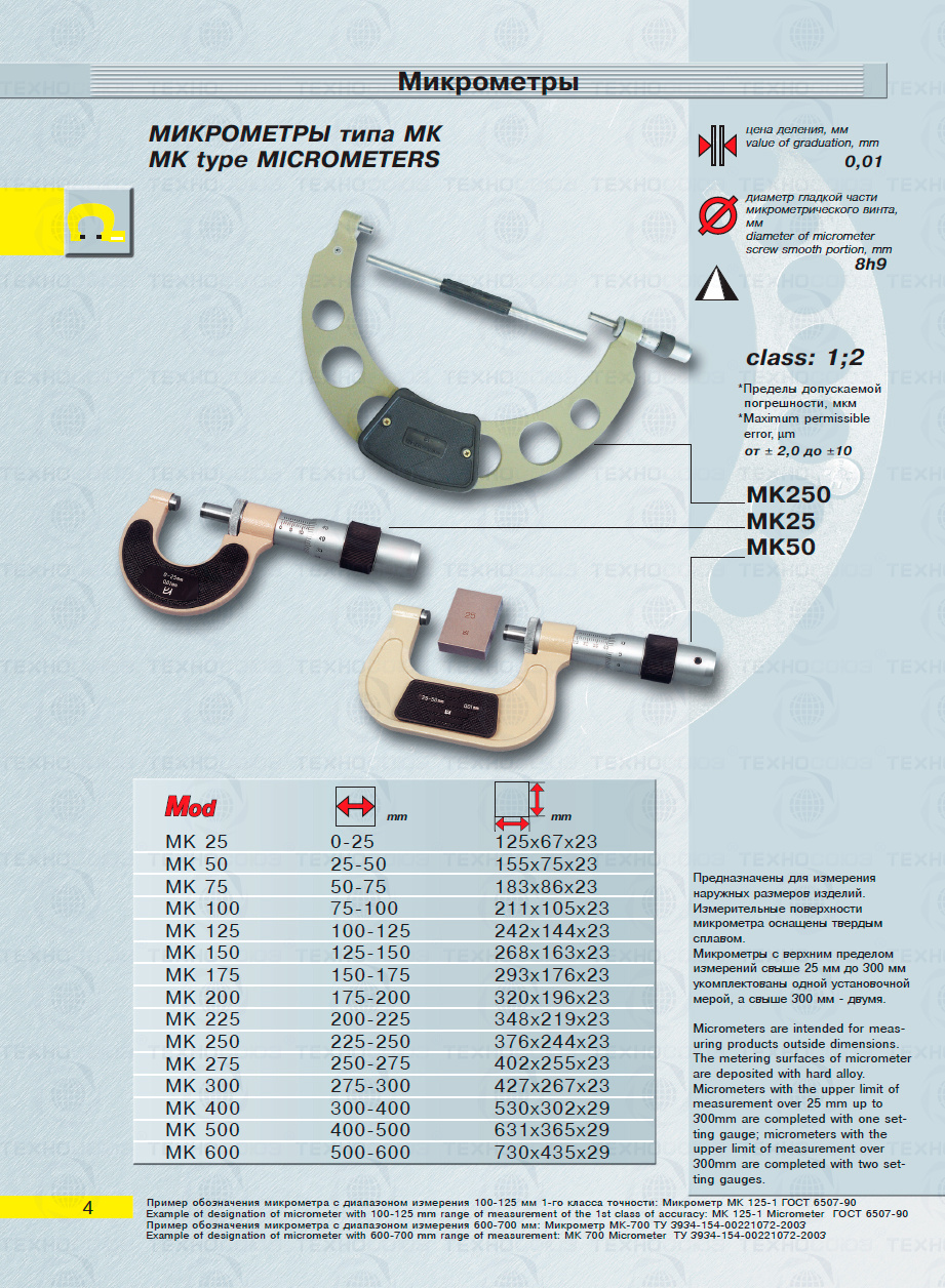 Цена деления 0,01 мм. Диапазон измерения от 300-400 мм. Для измерения наружных размеров изделий. Измерительные поверхности микрометра оснащены твердым сплавом. Микрометры укомплектованы установочная мера 2 шт. Класса точности 1. ГОСТ 6507-90. Поставляется в двух вариантах с поверкой и без поверки!