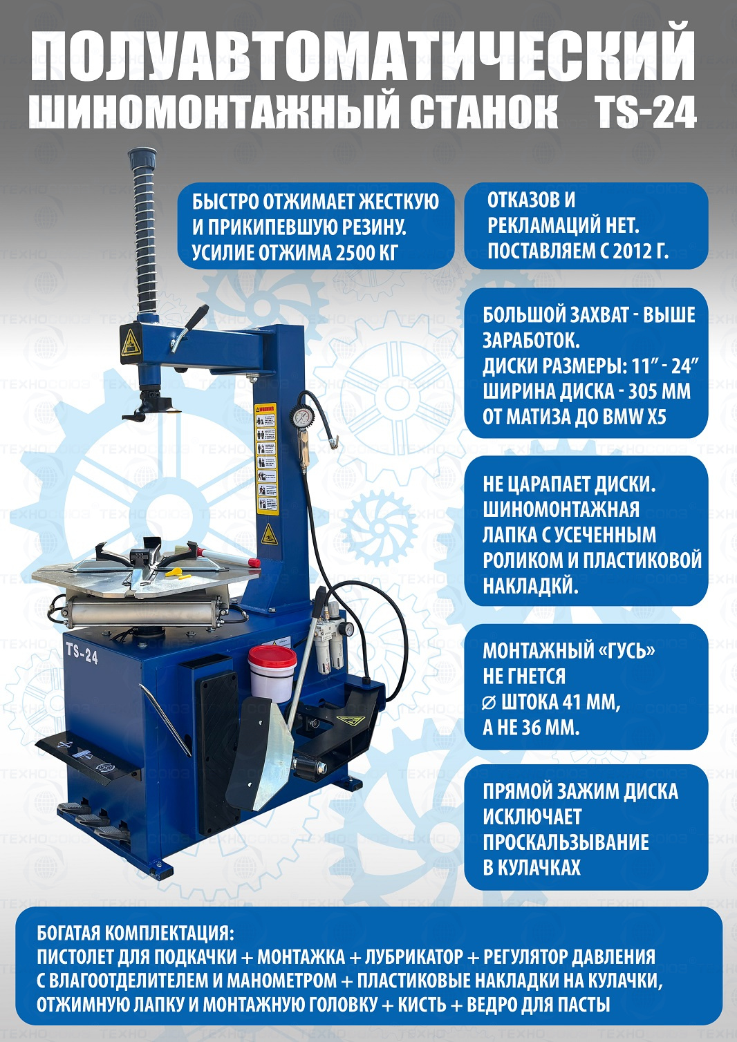 Шиномонтажного станка TS-24. Полуавтоматический. Квадратный стол. Для дисков:11÷24”. Усилие отрыва покрышки 2700 кг. В комплекте: пистолет для подкачки шин + монтажка + пластиковые накладки на зажимные кулачки + регулятор давления с влагоотделителем и манометром. Напряжение шиномонтажных станков 220В или 380В на выбор.
