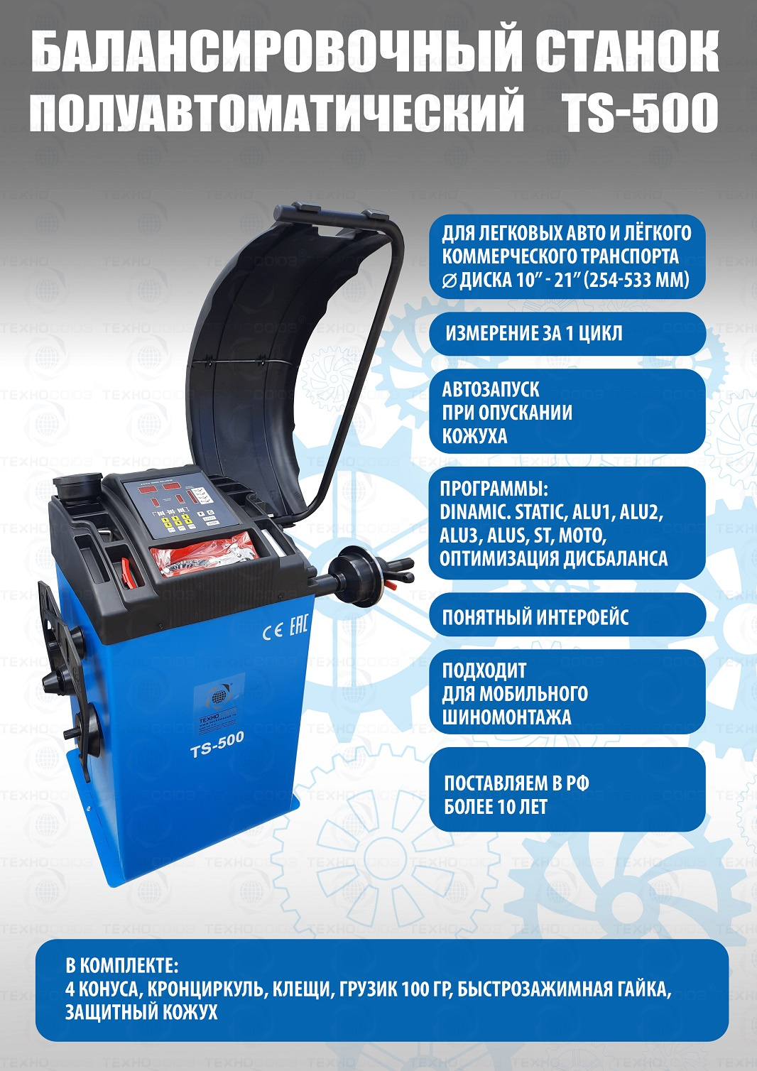 + TS-500 Балансировочный станок для колес легковых автомобилей, мотоциклов и легких грузовиков. В комплекте: кожух с автозапуском + клещи + кронциркуль + быстрозажимная гайка + набор конусов. Диаметр диска с резиной до 760 мм. Размеры диска: ширина 3–9” (76-228 мм) , диаметр диска" - 10–21” (254-533 мм). Вал-36 мм. Максимальный вес колеса с диском – 65 кг. Точность ±1гр. Напряжение 220В. Данные станки возим более 10 лет. Надежные - не подведут в сезон!!! .