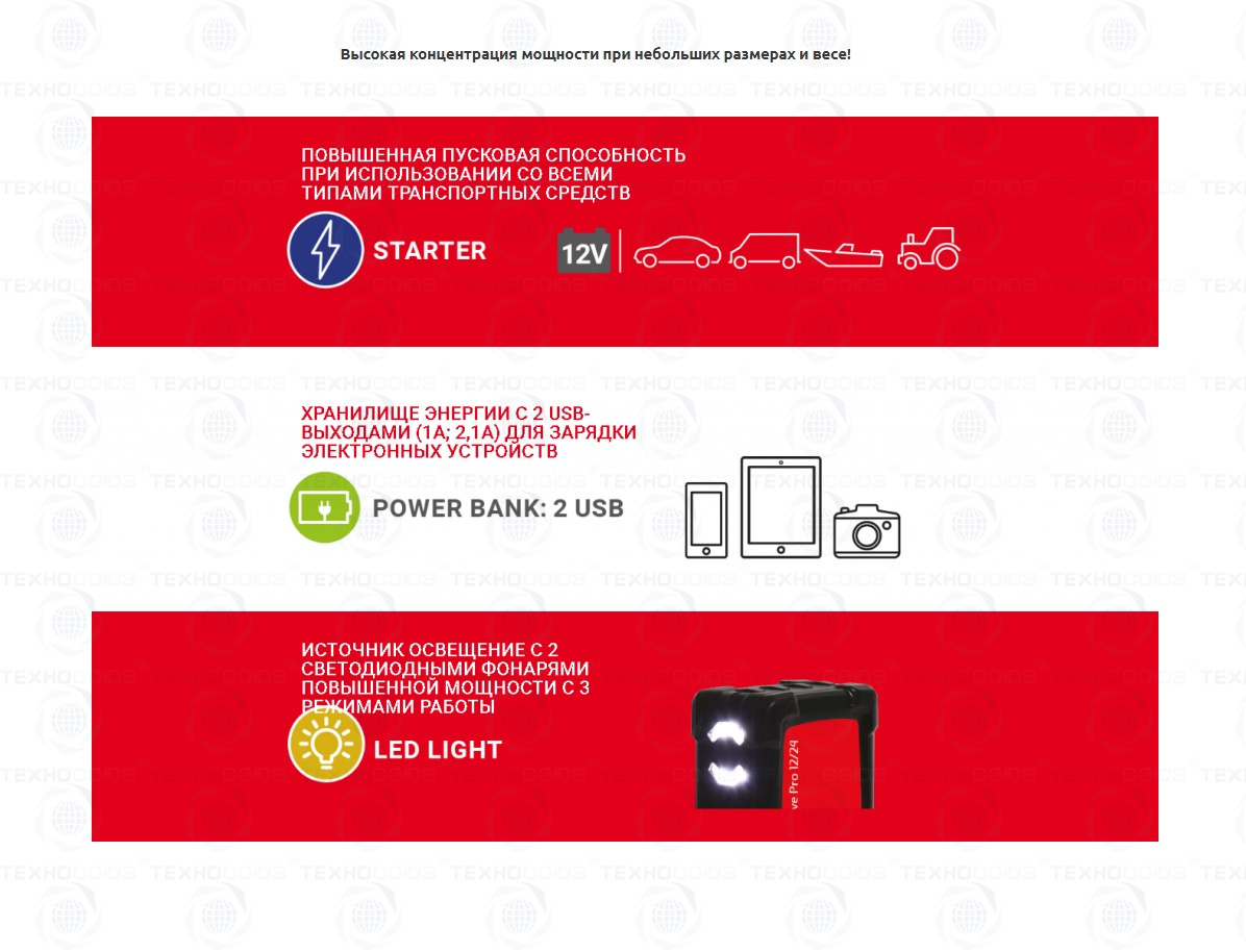 Надежное, универсальное и компактное (за счет литиевых аккумуляторов) пусковое устройство для профессионального использования. Корпус аппарата оснащен резиновой накладкой, которая обеспечивает его ударопрочность. Предусмотрена защита от неправильной полярности.