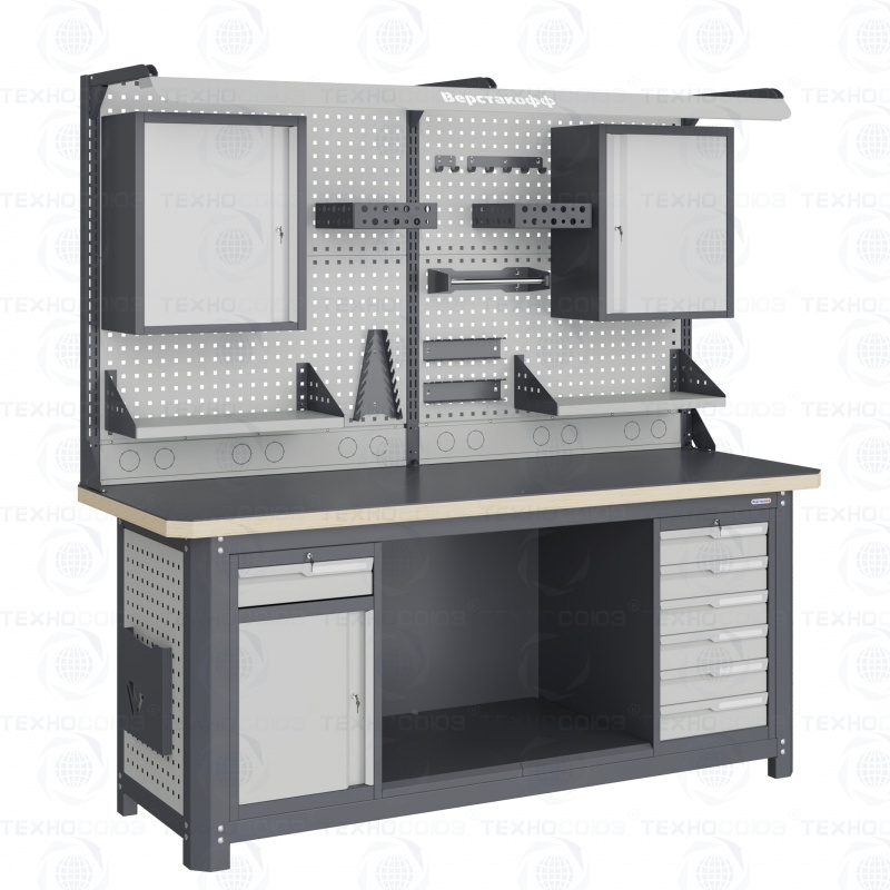 Нагрузка на столешницу 1500 кг. Столешница из листа влагостойкой фанеры марки ФСФ толщиной 40 мм и листом горячекатаной стали толщиной 5 мм. Рама верстака выполнена их холоднокатаной стали. Модуль верстака выполнен сварными. Ящики в модулях устанавливаются на шариковых телескопических направляющих полного выдвижения. Квадратная перфорация для установки крючков, держателей. Размеры: 1982x1993x743 мм.