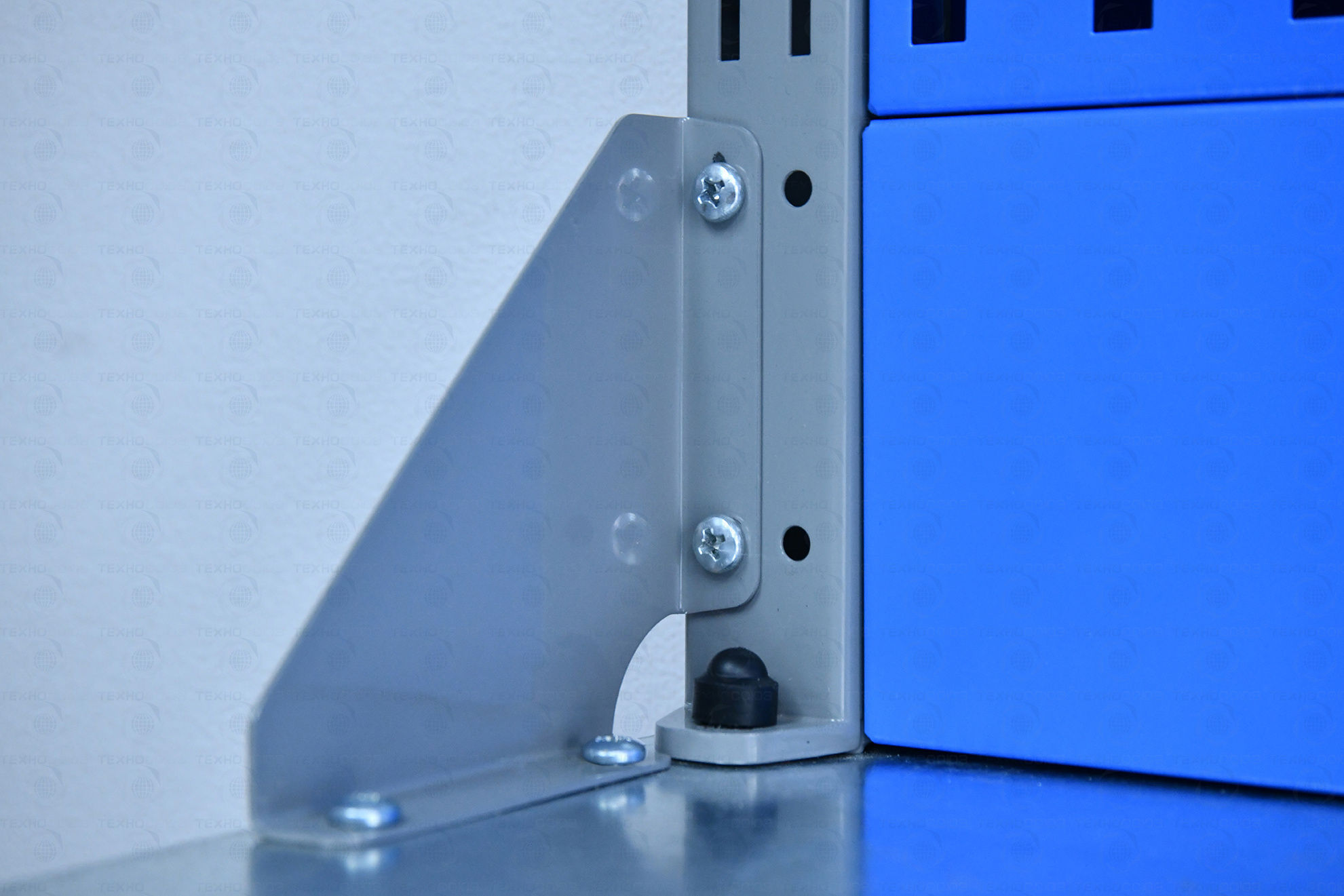 Все металлические элементы покрыты полиэфирной порошковой краской, обеспечивающей хорошую износостойкость покрытия и невосприимчивость его к моющим средствам и смазочным веществам. Цвет и текстура покрытия корпуса тумб, опор, полки-стенки, экранов и комплектов освещения RAL 5015, гладкая, полуматовая. Цвет и текстура покрытия ящиков и дверок верстака, кронштейнов экранов и косынок RAL 7037, гладкая, глянцевая. Цвет и текстура покрытия накладок ручек ящиков и дверок RAL 9006, гладкая, глянцевая.